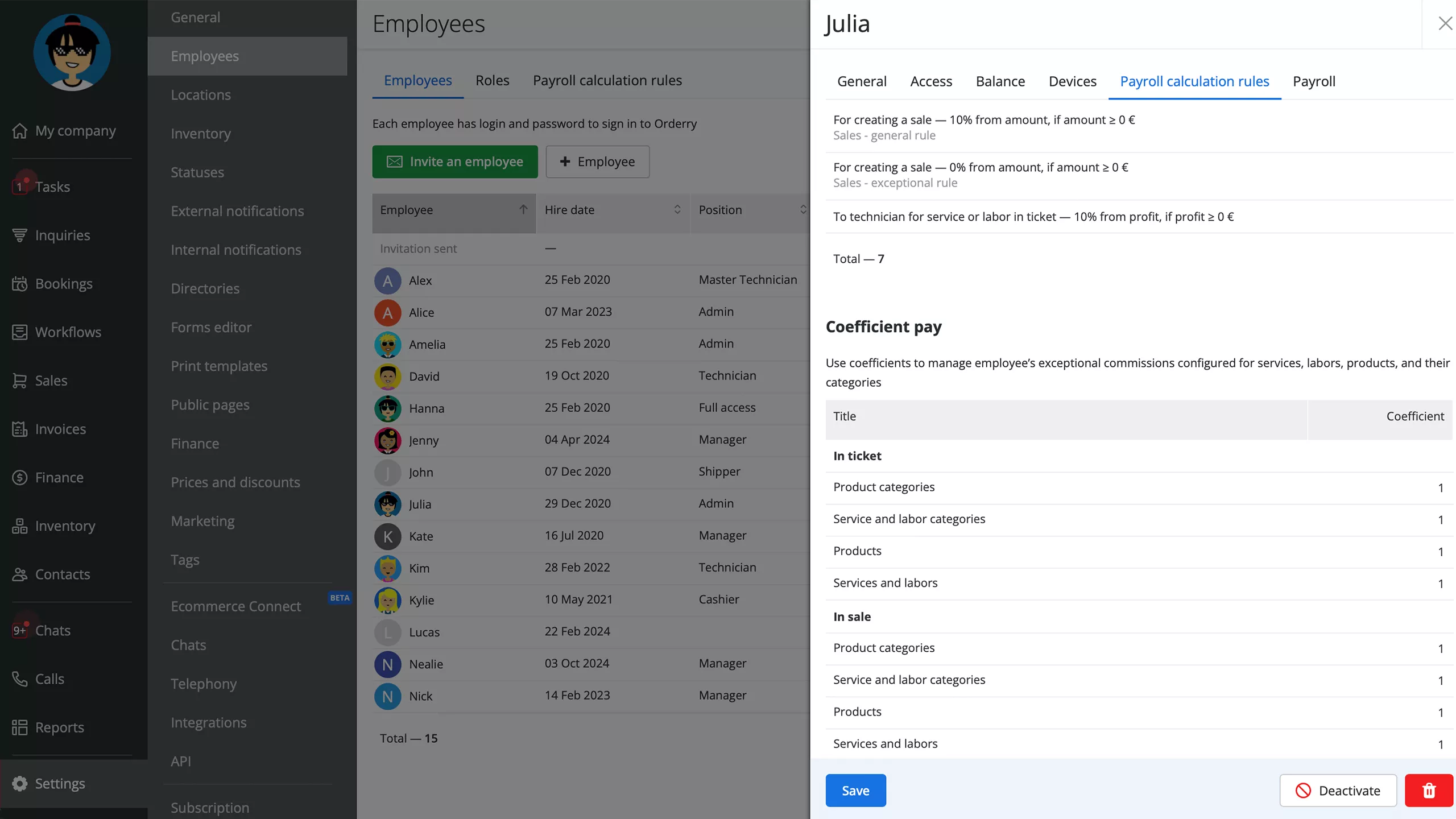 Sie können in RO App automatische Berechnungen für verschiedene Arten von Löhnen, Provisionen und Koeffizientenzahlungen einstellen. Am Ende des Monats müssen Sie nur einen Lohnbericht öffnen, um zu sehen, wie viel Sie jedem Mitarbeiter zahlen müssen.