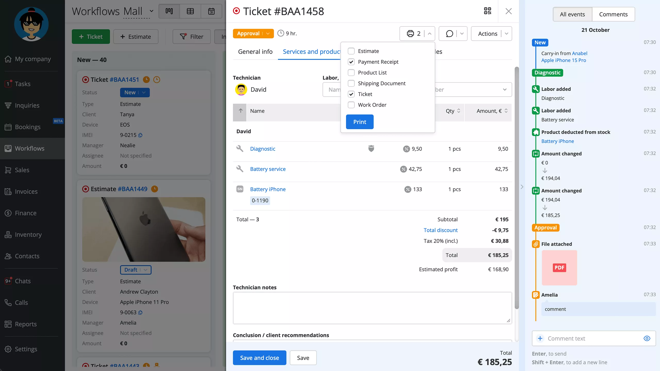Generate more than 20 types of reports on inventory, employees, leads, work orders, results of marketing activities, and finances in seconds. You can also set up a daily manager report to receive an email summary of your company’s activities over a given day.