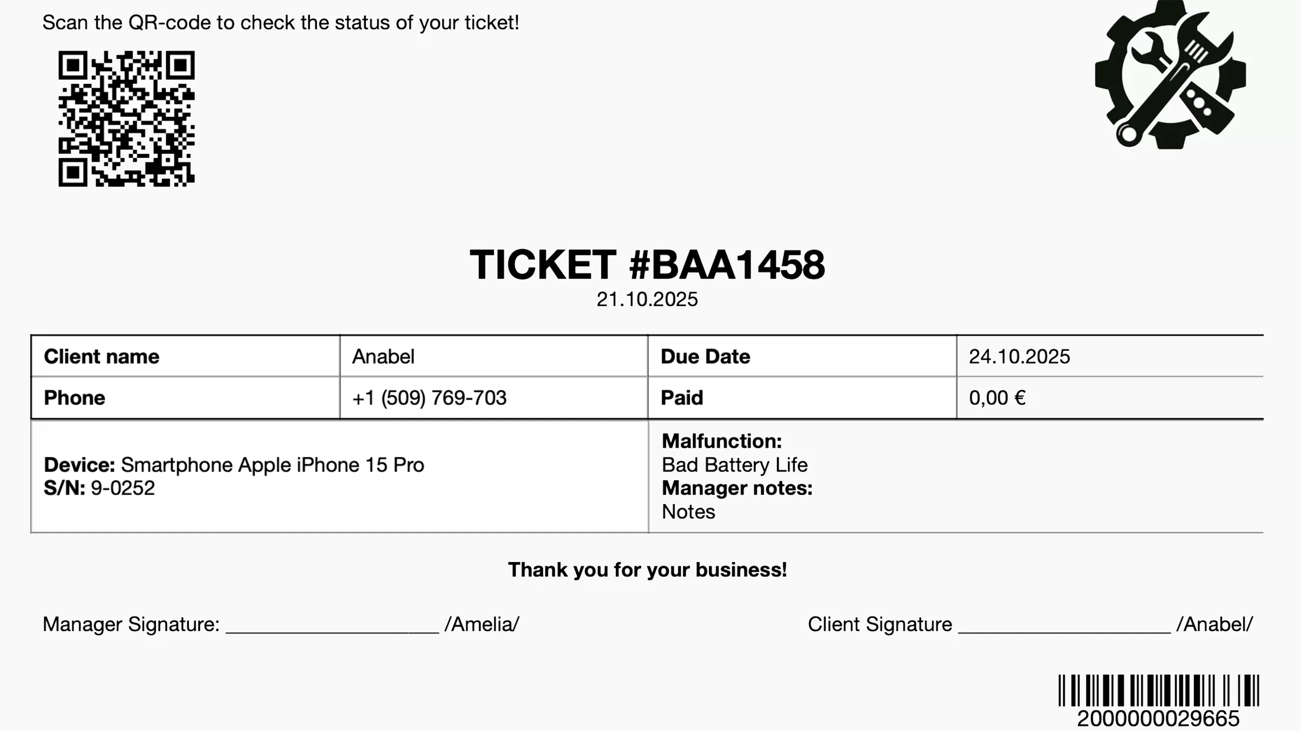 Funkcja ta pozwala Twoim technikom na natychmiastowe sprawdzenie szczegółów zlecenia, a Twoim klientom na sprawdzenie statusu lub wystawienie opinii. Aby to zrobić, wystarczy umieścić unikalny kod w dowolnej części dokumentu (rachunku, faktury lub paragonu), a kod QR zostanie automatycznie wygenerowany podczas drukowania.