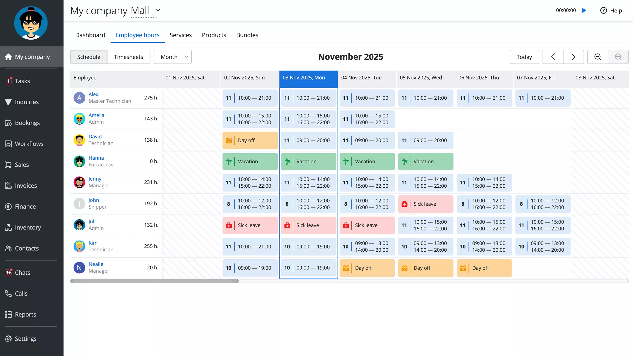 Track hours and days worked by your employees based on their individual work schedules. The program computes salaries and commissions for each worker, considering pay rates, coefficients, commissions, bonuses, and penalties.