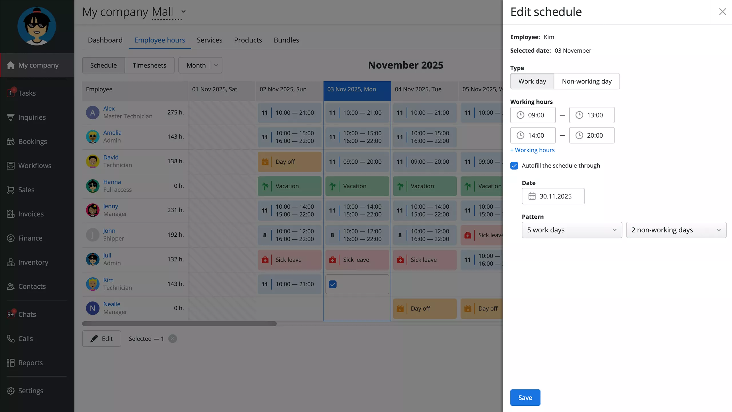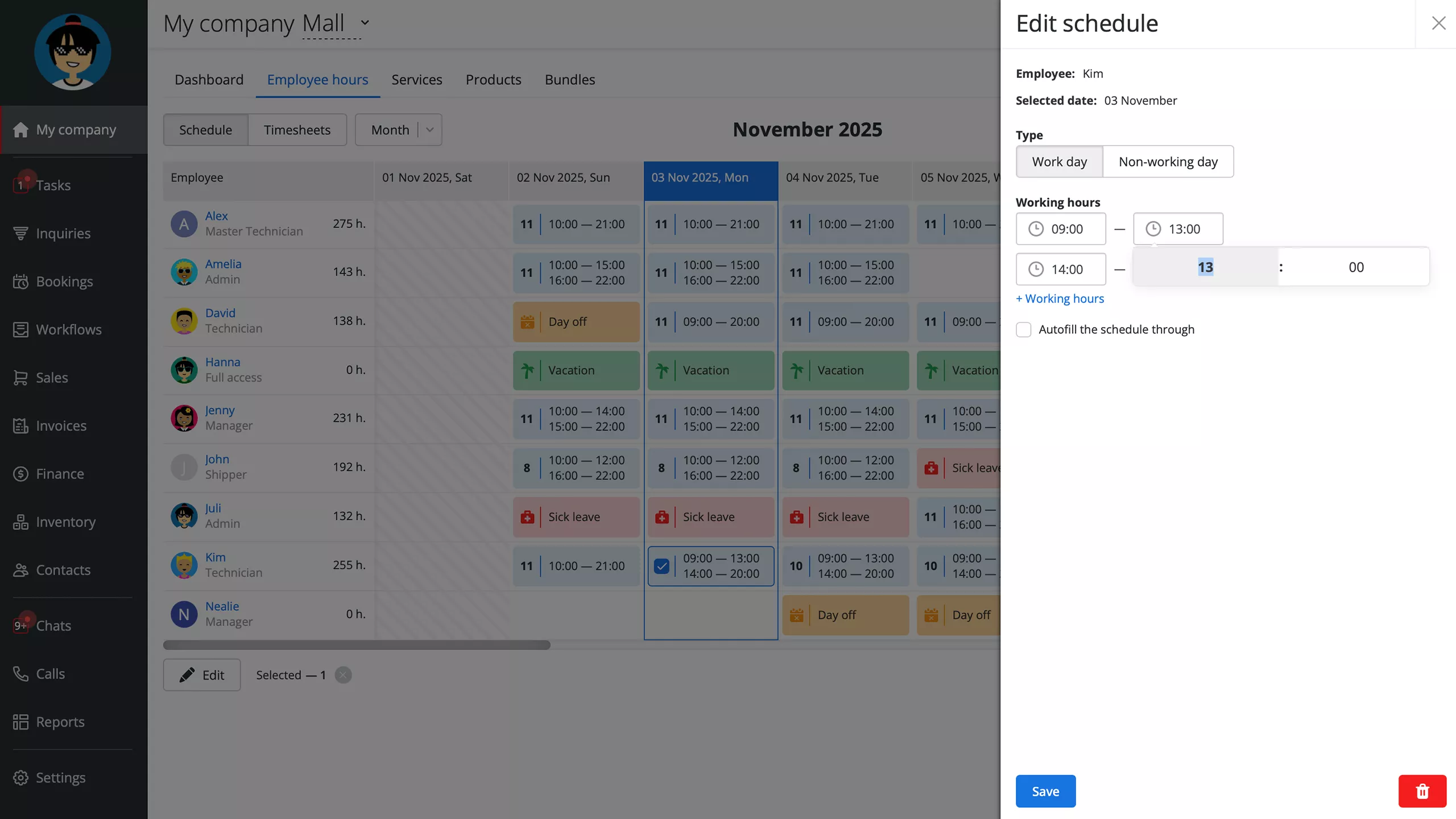 In the Work Order Scheduler, you will see employees’ working hours, including breaks and days off. This enables you to quickly schedule an appointment with a customer or create a work order that will match your team’s daily schedule.