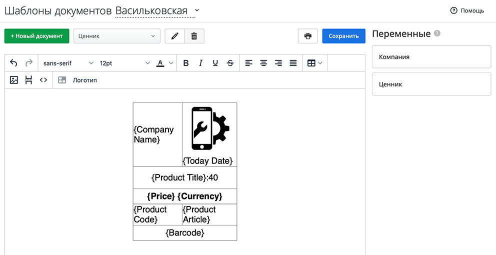 Комбинируйте переменные, отвечающие за экспорт информации о компании, товаре, и создавайте собственные шаблоны. Печатайте с помощью переменных названия, адреса, электронные ящики и реквизиты, а также наименования, описания и артикулы товаров. Настройте вид и печать этикеток в редакторе, ограничивайте длину названия товара и выбирайте оптимальный масштаб.