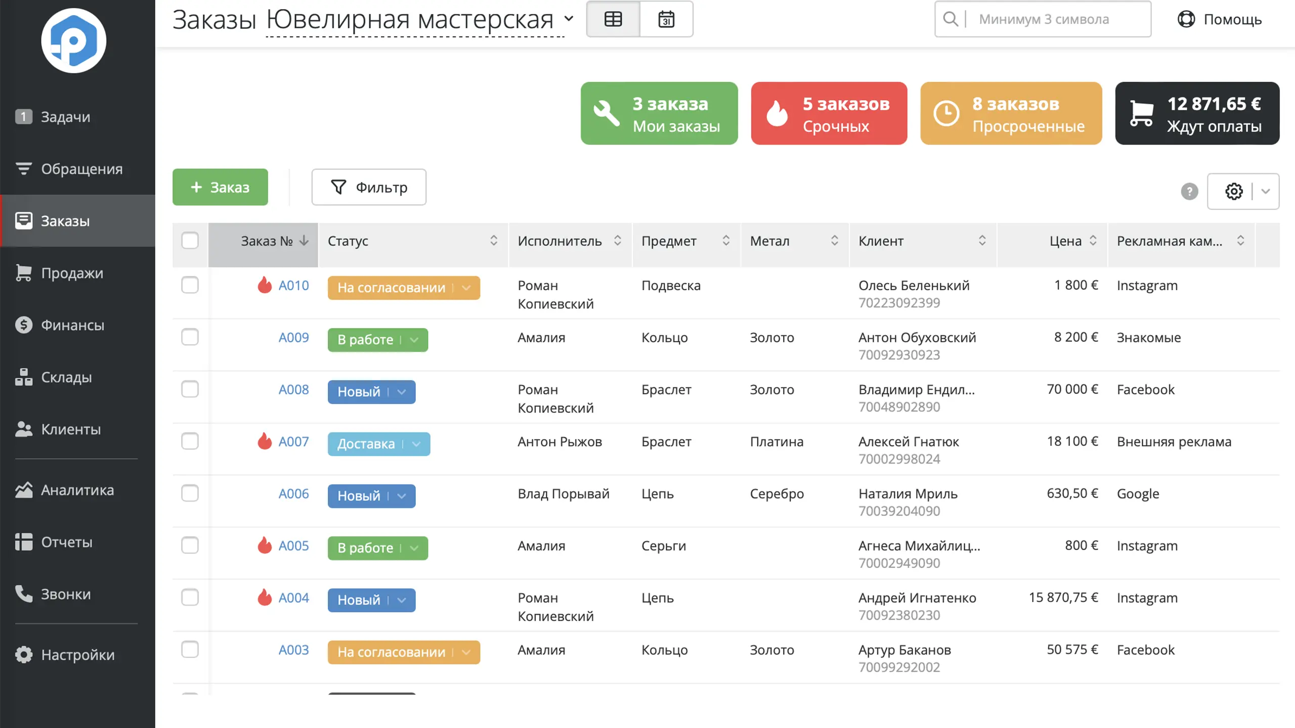 CRM для ювелирных мастерских собирает контакты клиентов и историю их заказов в одном месте. А учет ювелирных изделий поможет обезопасить их хранение во время ремонта.