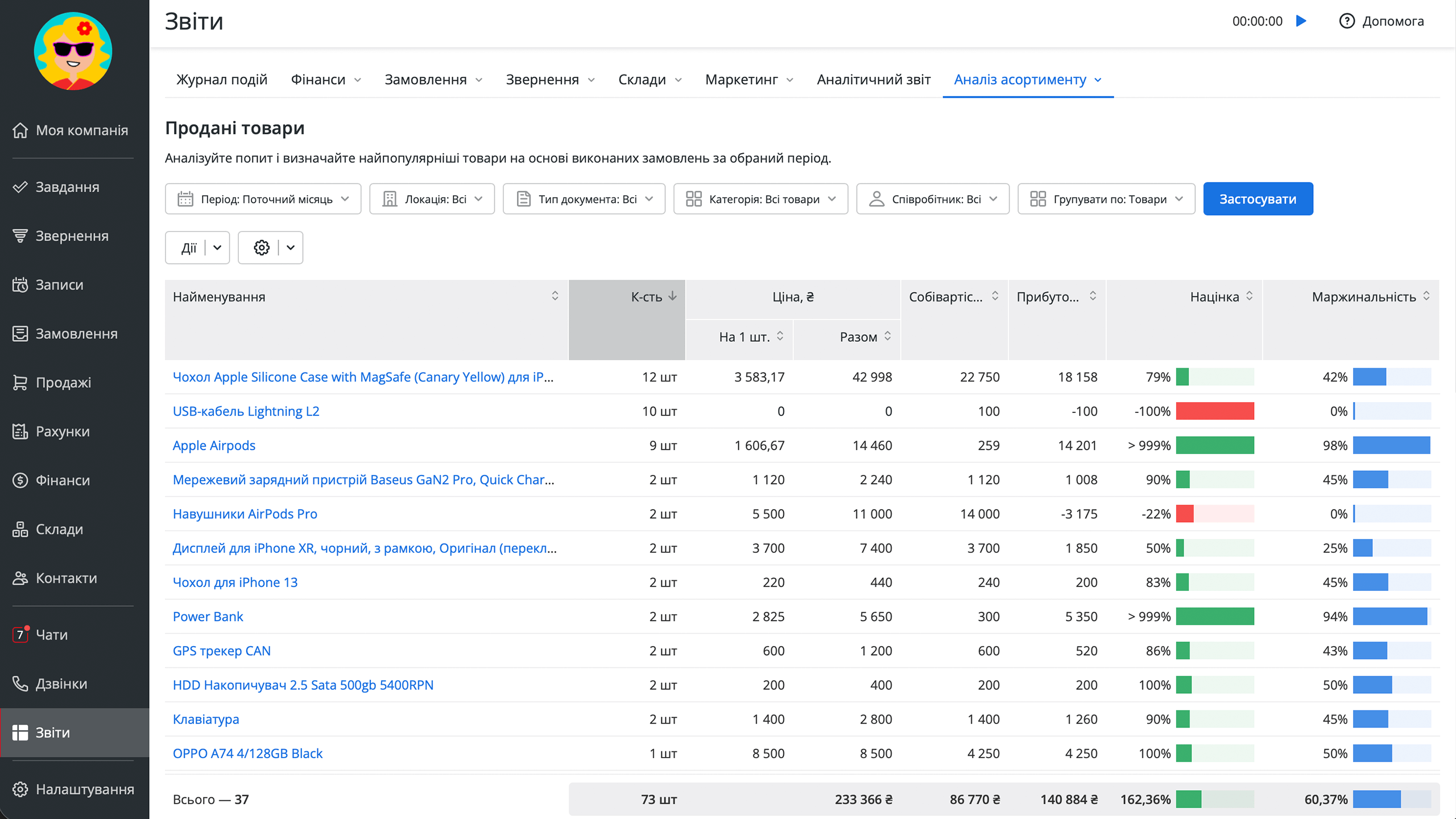 Більше продажів — більше прибутку. Виявляйте популярні у клієнтів і рентабельні позиції за допомогою звіту Аналіз асортименту, аби сформувати привабливий асортимент і збільшувати продажі. А торгівля на популярних маркетплейсах, з якими RO App інтегрується, дозволить збільшити оборотність товарів і заробляти більше.