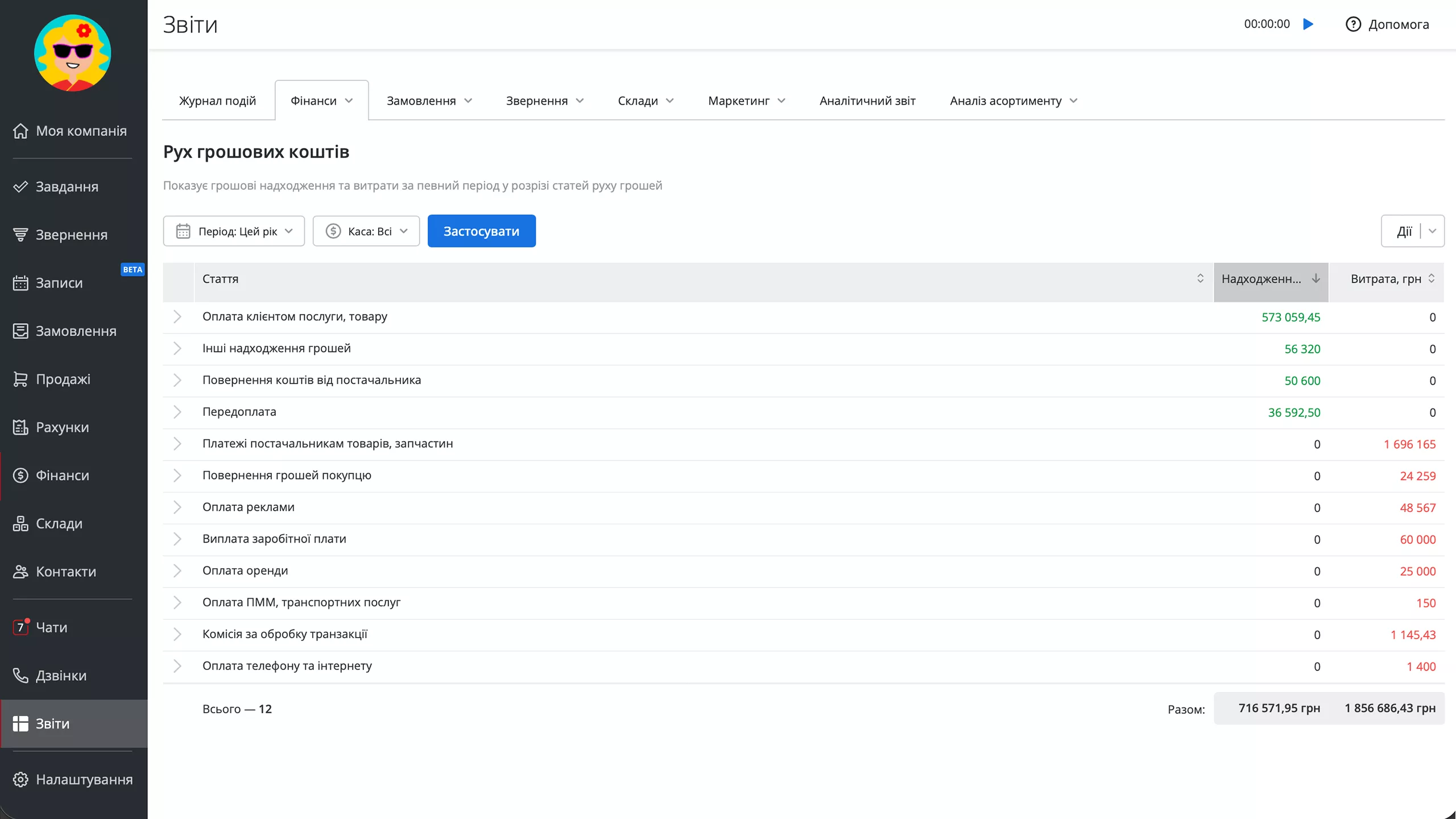 Аналізуйте ключові бізнес-показники та їх зміну протягом обраного періоду на діаграмах і трендах Аналітичного звіту. Відстежуйте дані по замовленням, зверненням, продажам, дзвінкам і обробці платежів у розрізі менеджерів і локацій, аби дивитися на знайомі цифри з нових сторін і виявляти корисні закономірності.