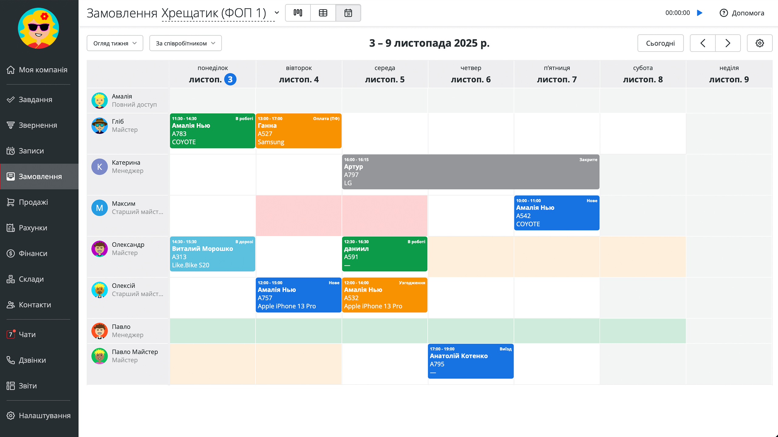 Призначайте відповідальних, контролюйте терміни за допомогою статусів, відстежуйте хід робіт, коментарі та дії співробітників. А автоматичні повідомлення для майстрів в Telegram дозволять сповіщати їх про будь-які зміни в деталях замовлення.