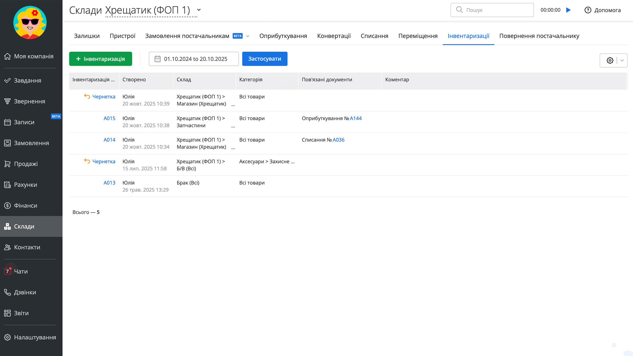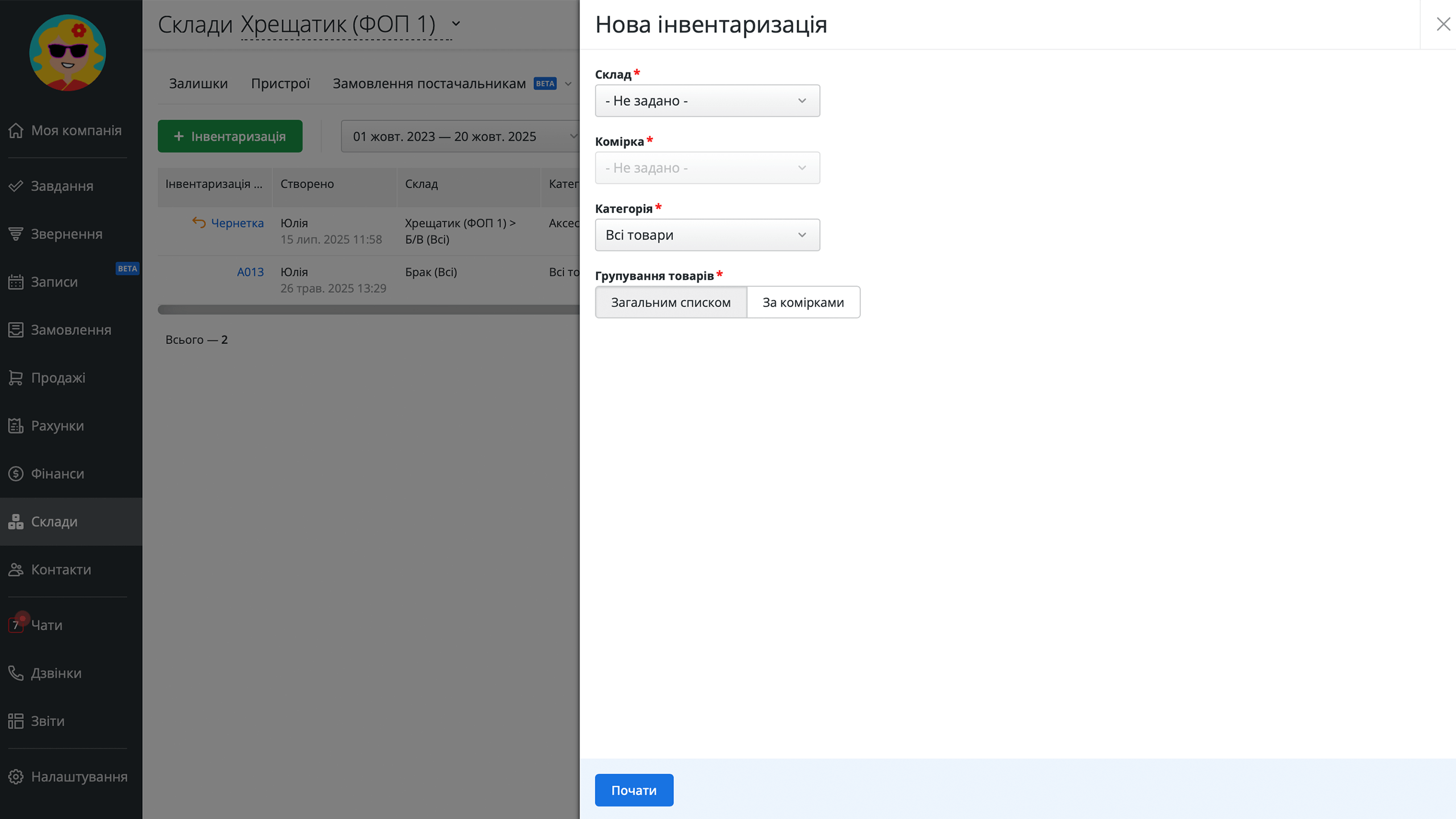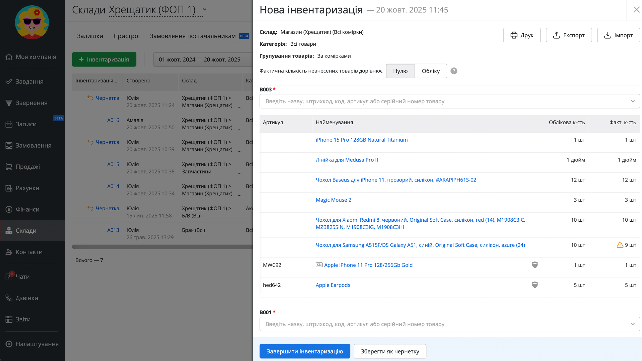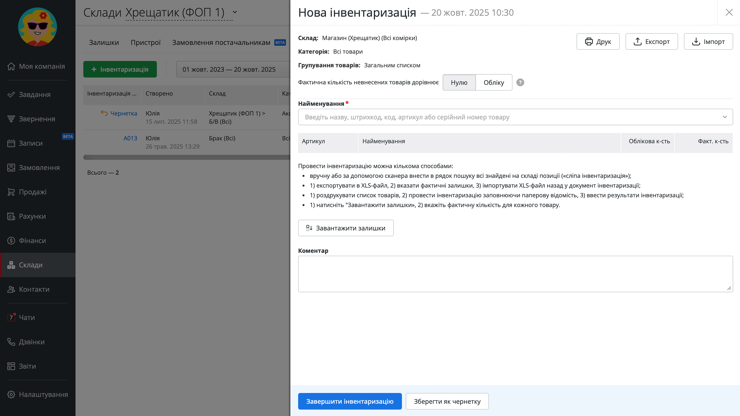 Проведіть всі необхідні документи перед інвентаризацією товарів на складі. Можливо, ви забули списати, перемістити або оприбуткувати якісь позиції. Актуальний рух залишків має бути відображено в системі.