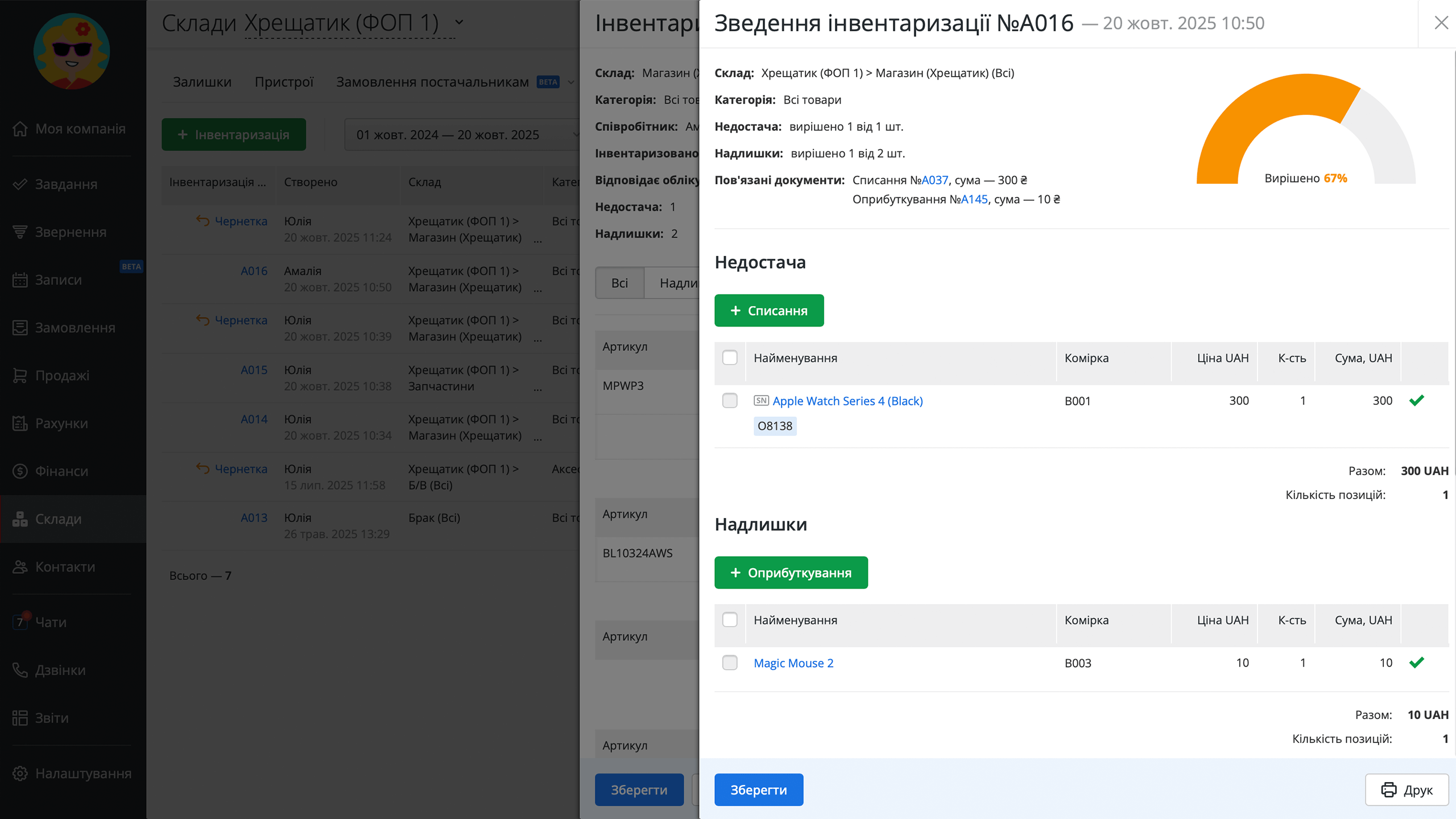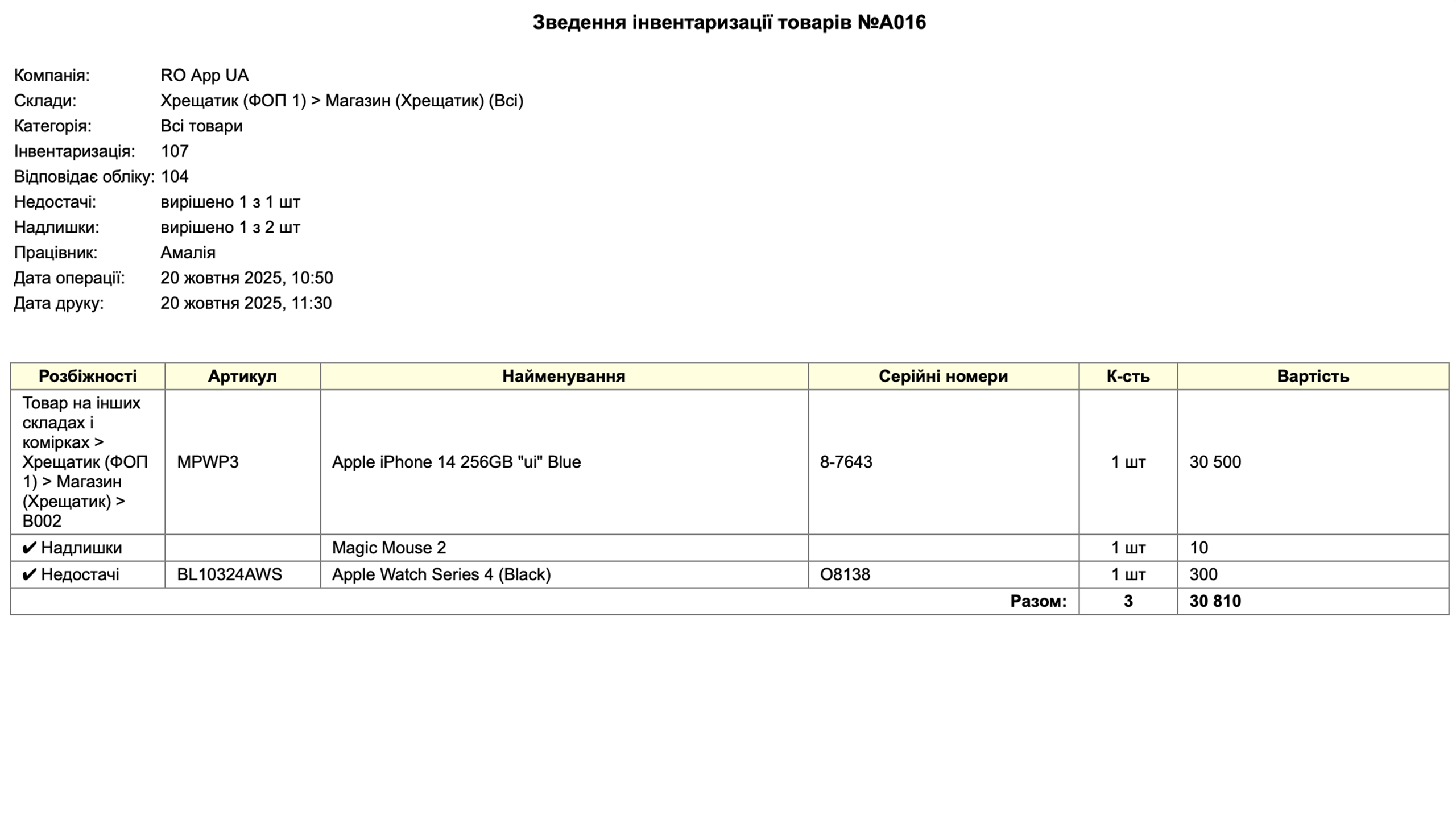 Після завершення перерахунку в системі формується підсумковий акт інвентаризації товару на складі. Ви зможете роздрукувати таблиці з переліком позицій та розбіжностями. Для вирішення останніх в RO App можна проводити переміщення, оприбуткування та списання.