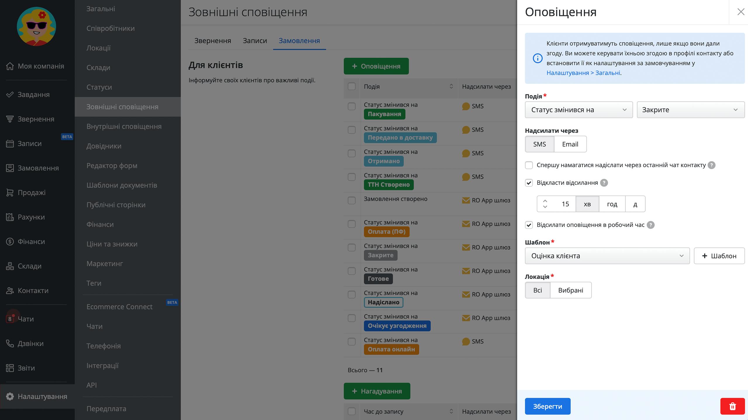 Налаштуйте автоматичну відправку повідомлень клієнтам про створення або зміну статусу замовлення, щоб тримати їх у курсі подій і підвищувати лояльність.