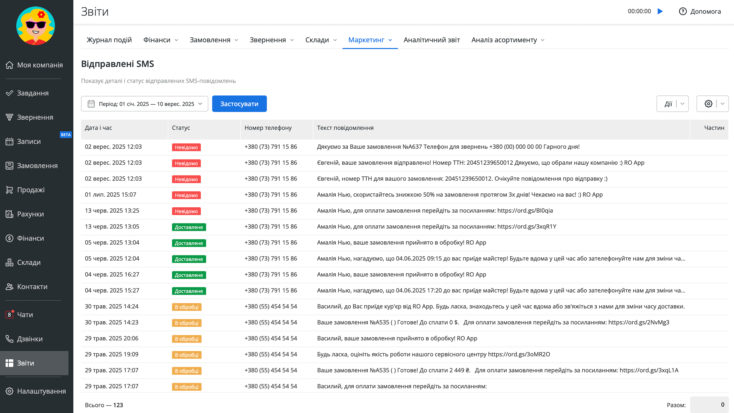 Слідкуйте за тим, щоб клієнти отримували важливі оповіщення. У звіті по відправленим SMS ви знайдете, в якому статусі знаходиться повідомлення, кому воно було відправлено і на скільки частин воно вийшло. Також відправлені SMS відображаються в Стрічці подій замовлення і картці клієнта на вкладці SMS.
